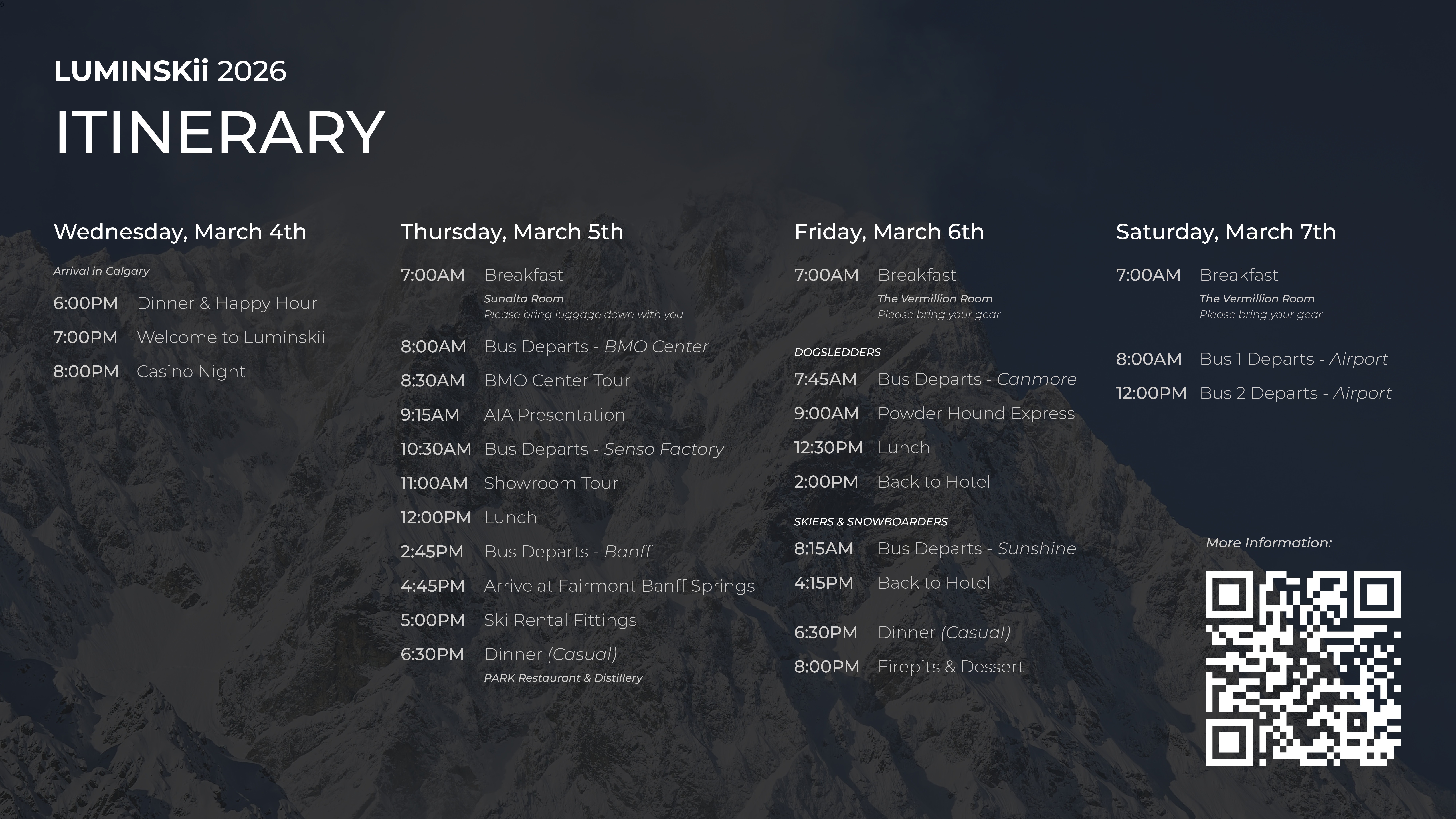 On Friday evening, we escape to Banff, where adventure meets luxury. Picture yourself hiking scenic trails, dogsledding through snowy landscapes, skiing breathtaking slopes, or simply unwinding with incredible food and stunning mountain views. Over the next four days, Banff’s natural beauty and unforgettable experiences will set the stage for lasting memories.